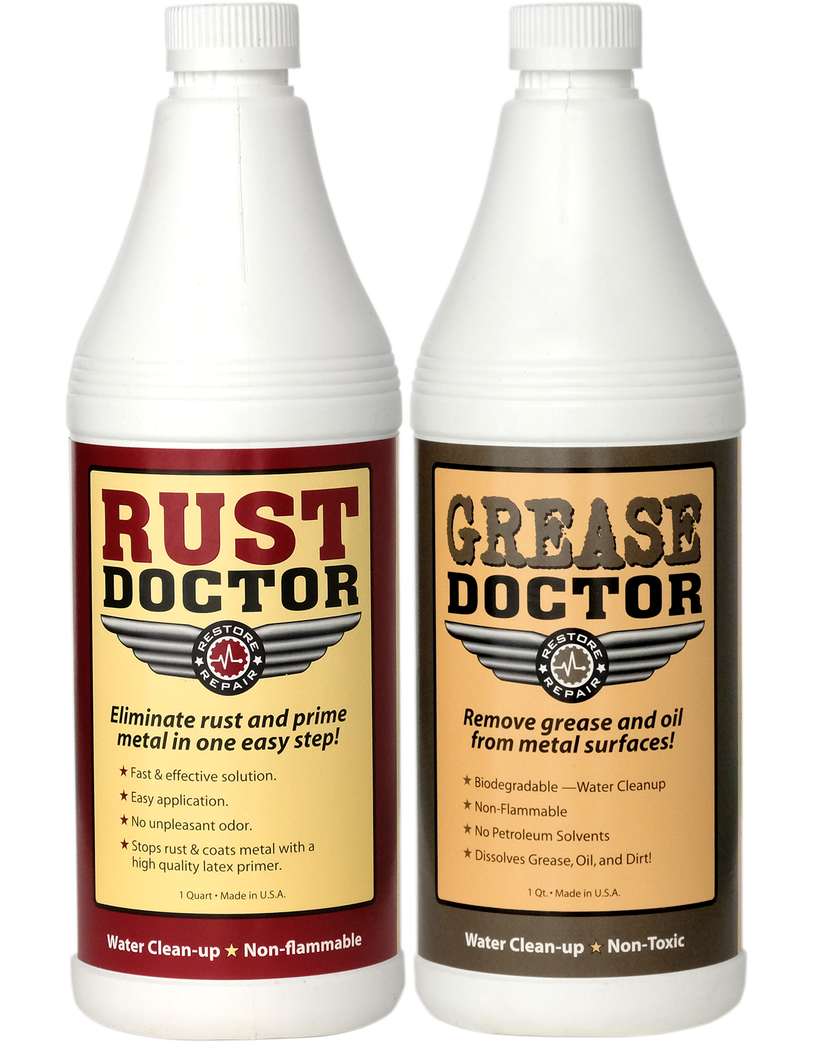 Prior to treating with Rust Doctor, the surface must be cleaned with a water based cleaner to remove grease, oil, dirt and any other contamination. Don’t be fooled, you can’t always see contamination on a rusty surface. One of the most effective ways to prepare greasy metal is with a chemical degreaser. Grease Doctor is a water-based cleaner that effectively removes dirt, grease, and oil from rusty metal prior to using Rust Doctor. Grease Doctor is also a concentrate that may be mixed with water — one quart will make several gallons of cleaner. In areas that just need dirt removed, Grease Doctor is mixed with water at a rate of 10 parts water to 1 part Grease Doctor. Click here to see other uses for Grease Doctor.
